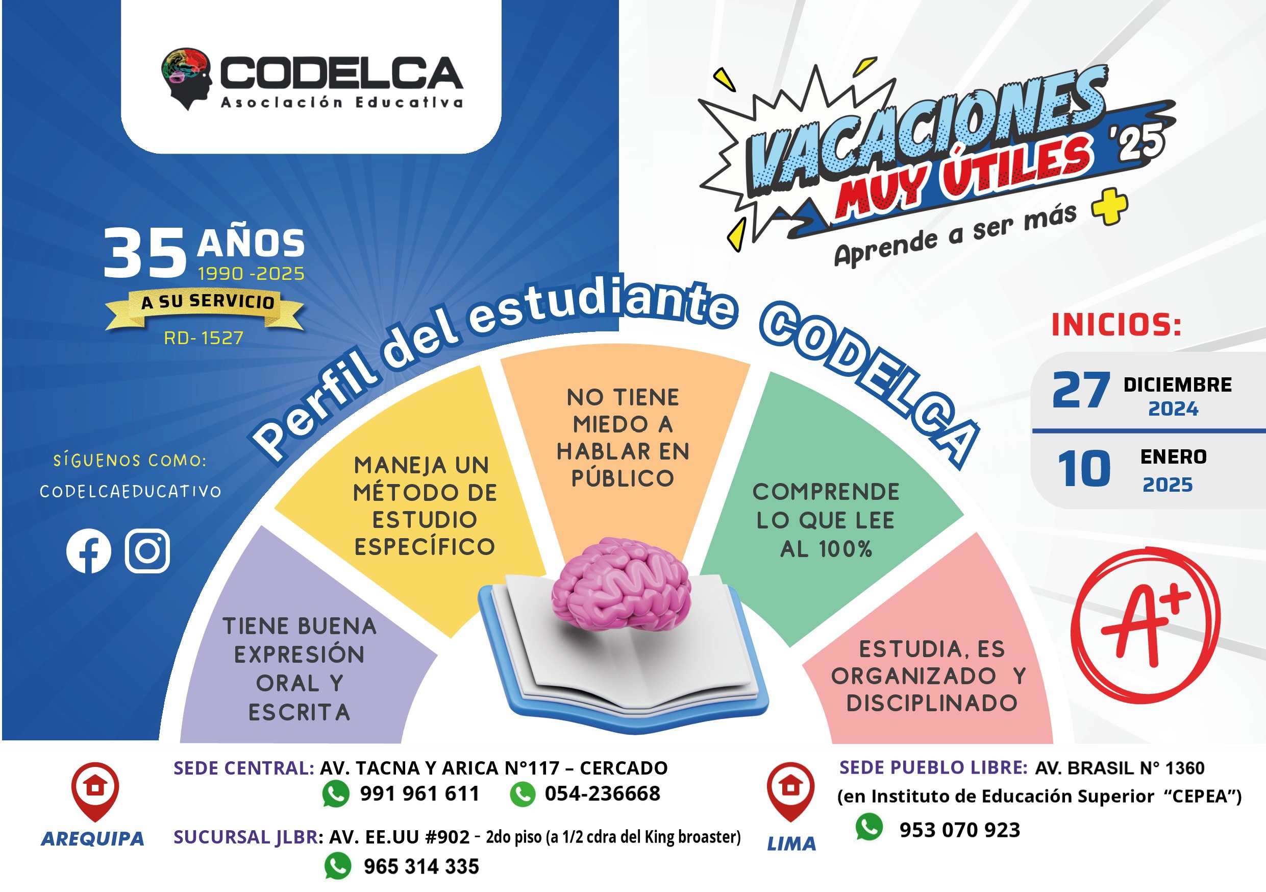 CODELCA: VACACIONES MUY ÚTILES 2025 La Asociación Educativa de Metodología Intelectual CODELCA, con 35 años de servicio en la región Arequipa, preocupado en solucionar problemas […]